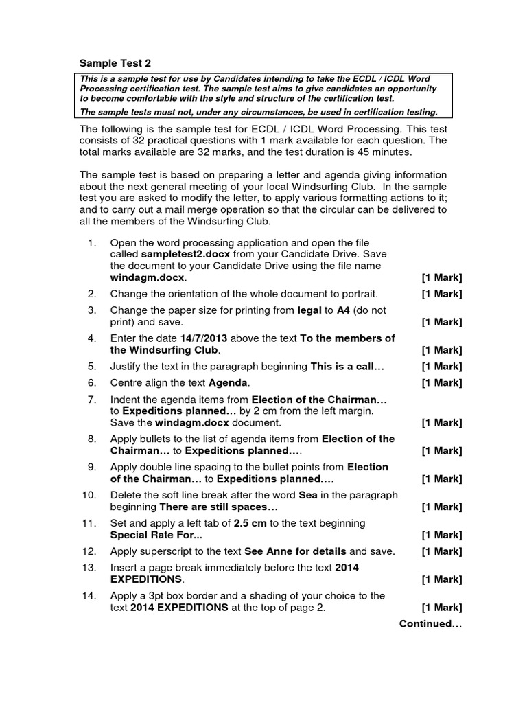 The following is the sample test for ECDL / ICDL Word Processing. This test