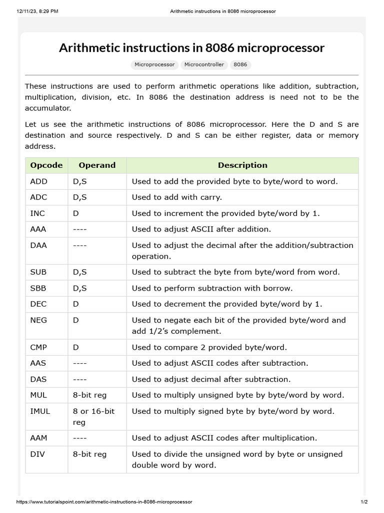 https://www.tutorialspoint.com/arithmetic-instructions-in-8086-microprocessor 1/2