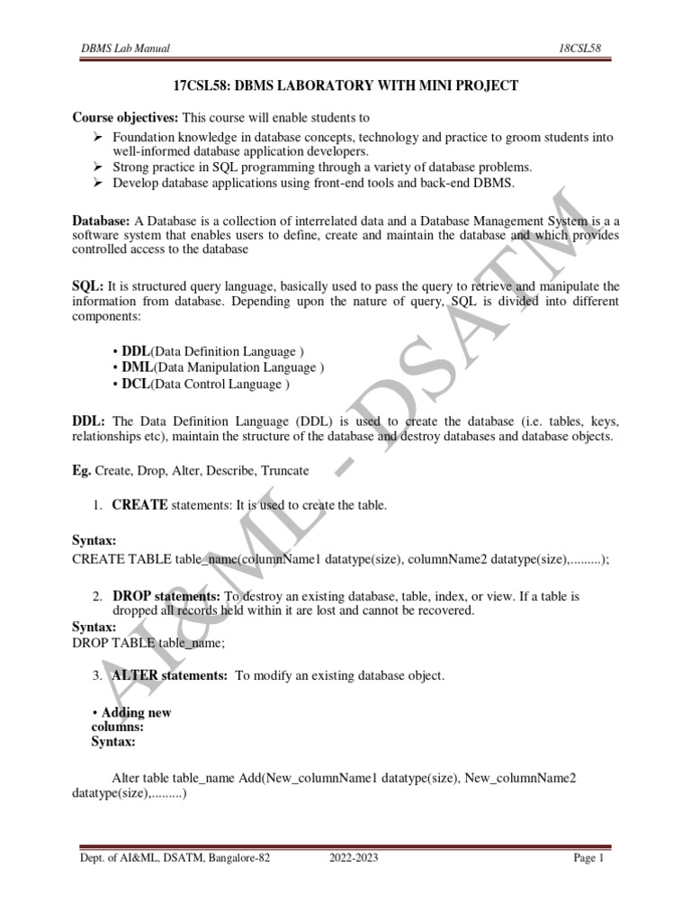 17CSL58: DBMS LABORATORY WITH MINI PROJECT