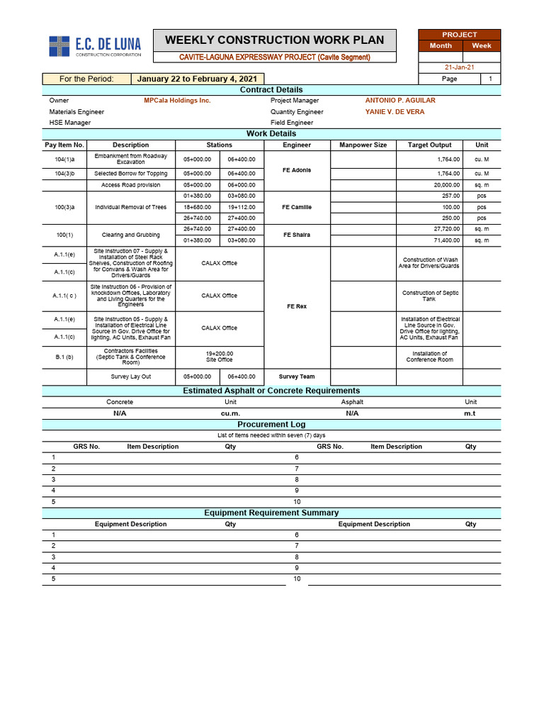 WEEKLY CONSTRUCTION WORK PLAN Month Week
