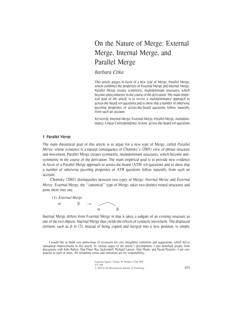 Merge. External Merge, the ‘‘canonical’’ type of Merge, takes two distinct rooted structures and