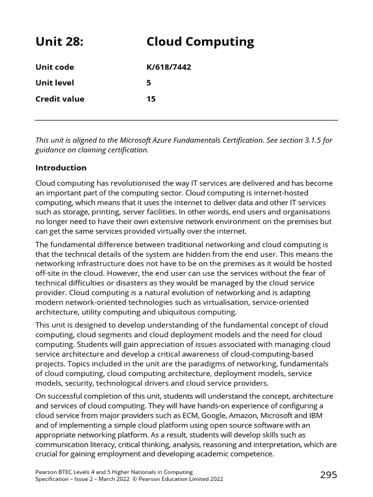 This unit is designed to develop understanding of the fundamental concept of cloud