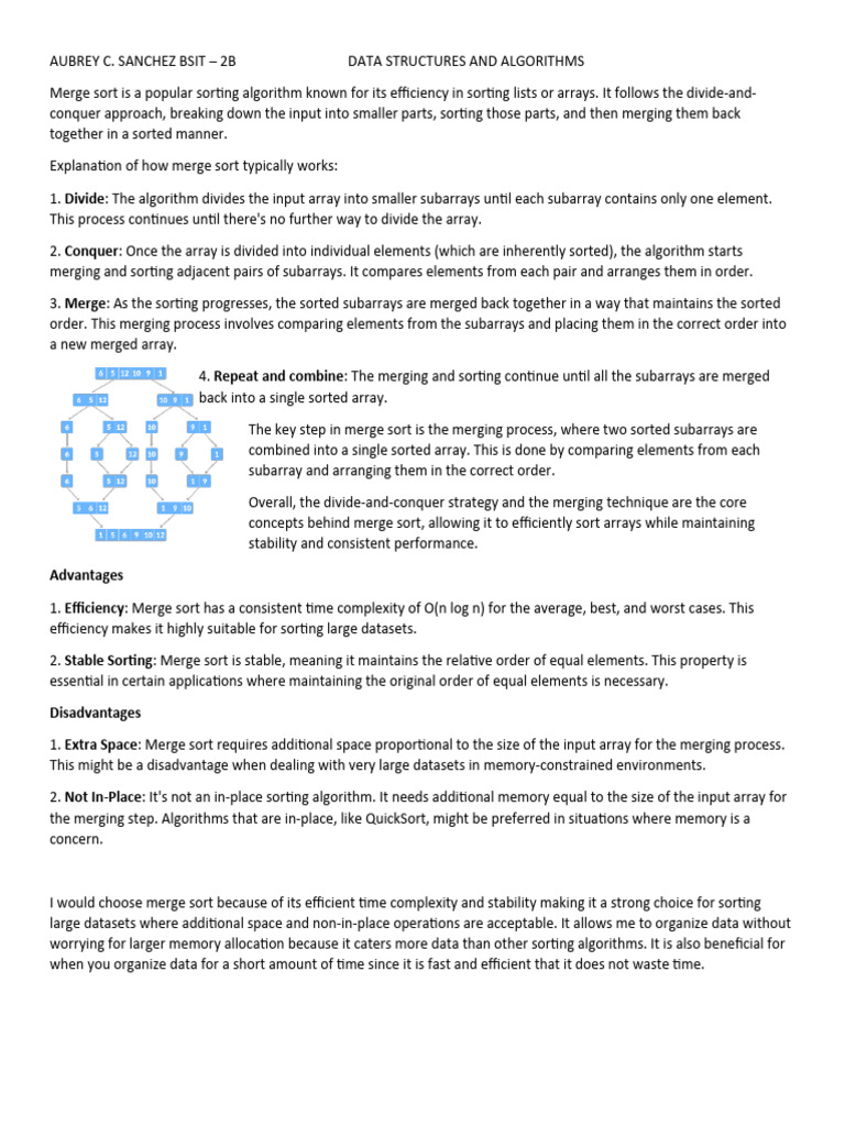 1. Efficiency: Merge sort has a consistent time complexity of O(n log n) for the average, best, and worst cases. This