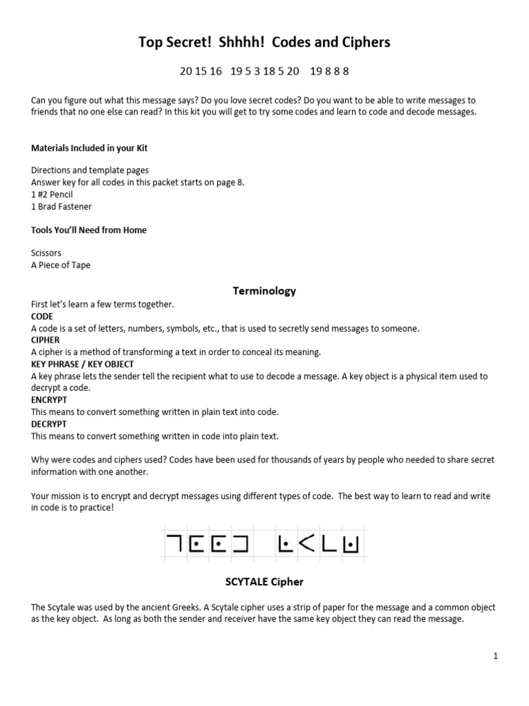 friends that no one else can read? In this kit you will get to try some codes and learn to code and decode messages.