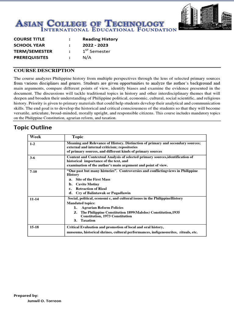 The course analyzes Philippine history from multiple perspectives through the lens of selected primary sources