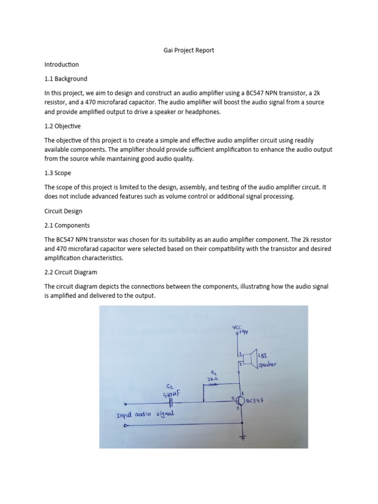 The objective of this project is to create a simple and effective audio amplifier circuit using readily