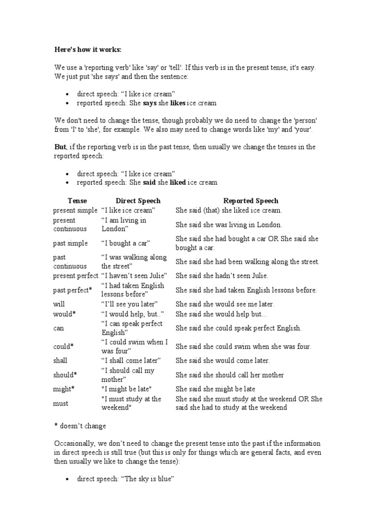 direct speech: I like ice cream reported speech: She said she liked ice cream Reported Speech She said (that) she liked ice cream. She said she was living in London. She said she had bought a car OR She said she bought a car. She said she had been walking along the street. She said she hadnt seen Julie. She said she had taken English lessons before. She said she would see me later. She said she would help but... She said she could speak perfect English. She said she could swim when she was four. She said she would come later. She said she should call her mother She said she might be late She said she must study at the weekend OR She said she had to study at the weekend