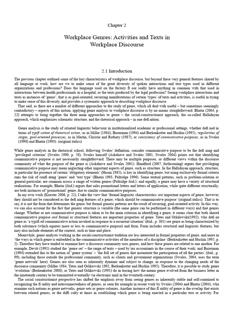 The topic of genre in workplace discourse is a recurring one in this book. In the following chapter, which examines workplace