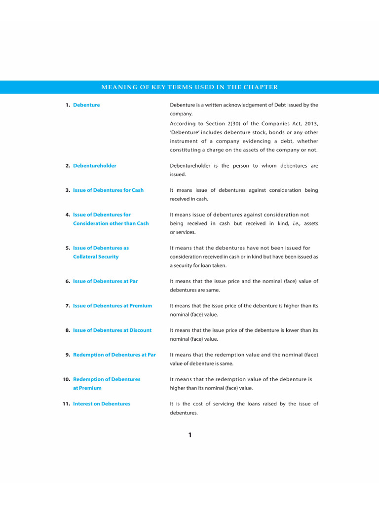 + Debenture: Debentureis a written acknowledgement of a debt by the company. It contains the terms for