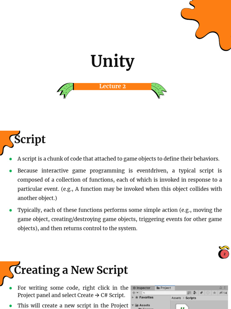 ● A script is a chunk of code that attached to game objects to define their behaviors.