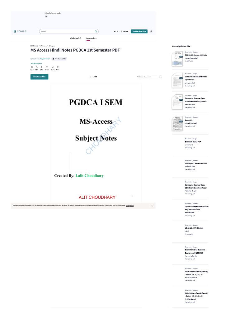 Data Type of MS Access: - MkVk dh izd`fr ds vk/kkj ij MkVk dbZ izdkj dk gksrk gSA ,e ,l ,sDlsl Document 11 pages