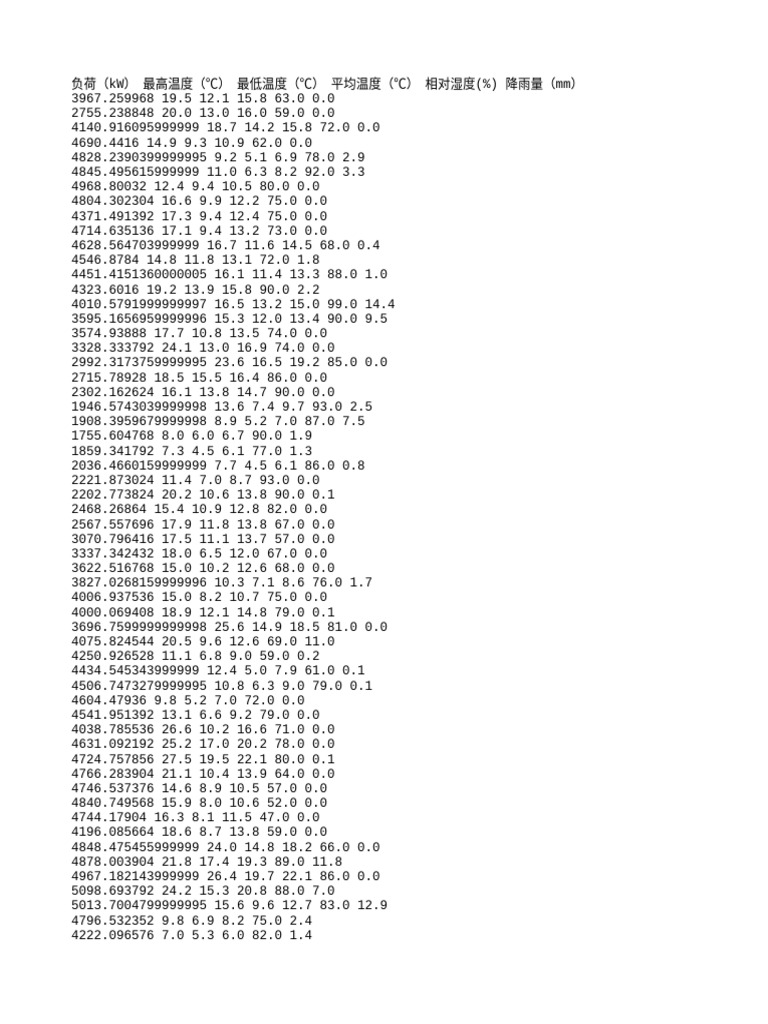 负荷(kW) 最高温度(℃) 最低温度(℃) 平均温度(℃) 相对湿度(%) 降雨量(mm)