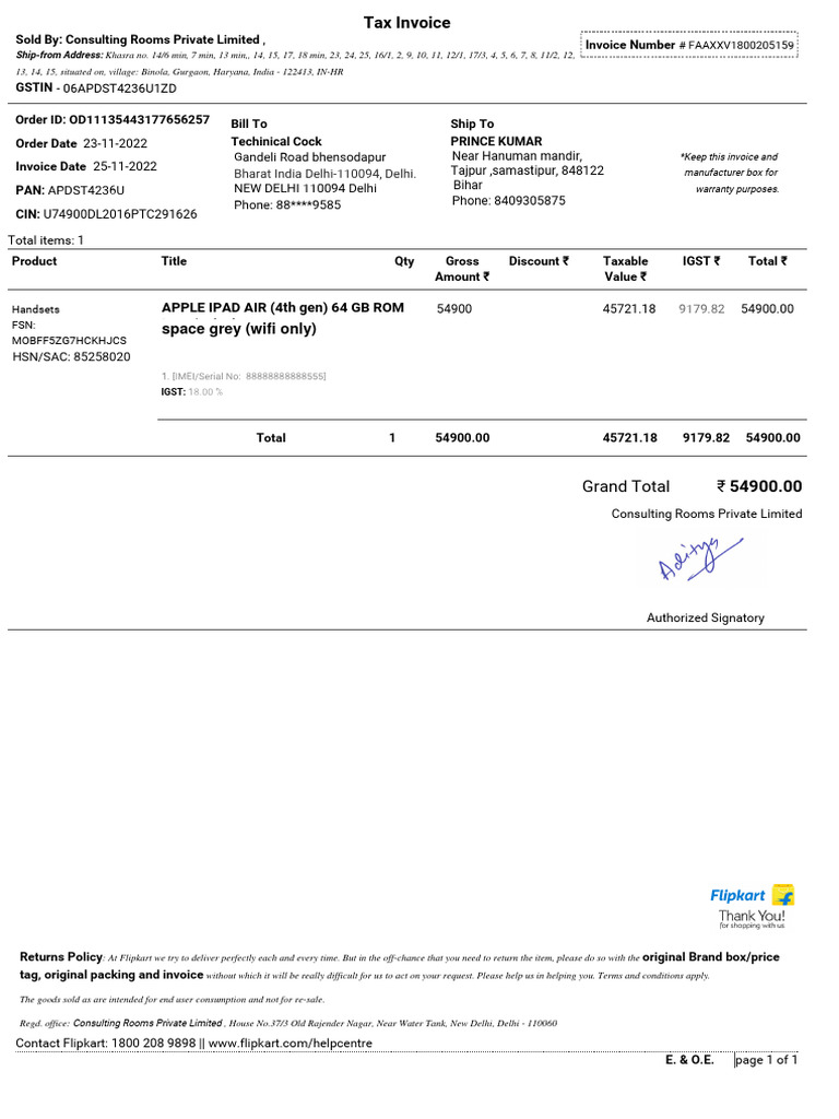 Sold By: Consulting Rooms Private Limited , Invoice Number # FAAXXV1800205159