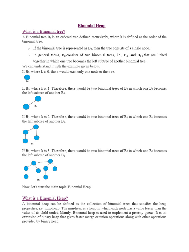 A Binomial tree Bk is an ordered tree defined recursively, where k is defined as the order of the