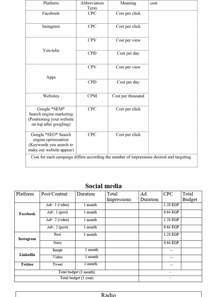 Platform Ads. Content Total impressions CPI Duration Total budget