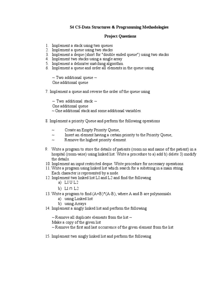 S4 CS-Data Structures & Programming Methodologies Project Questions 1. 2. 3. 4. 5. 6.