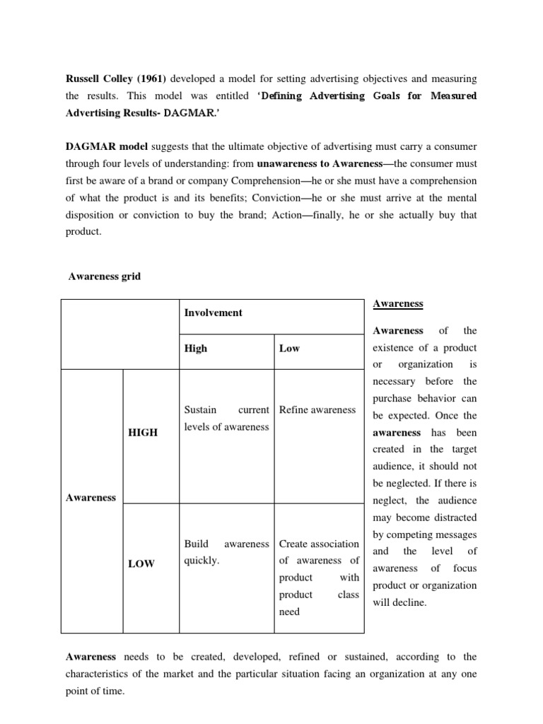 This model was entitled Defining Advertising Goals for Measured Advertising Results- DAGMAR. DAGMAR model suggests that the ultimate objective of advertising must carry a consumer through four levels of understanding: from unawareness to Awarenessthe consumer must first be aware of a brand or company Comprehensionhe or she must have a comprehension of what the product is and its benefits; Convictionhe or she must arrive at the mental disposition or conviction to buy the brand; Actionfinally, he or she actually buy that product.