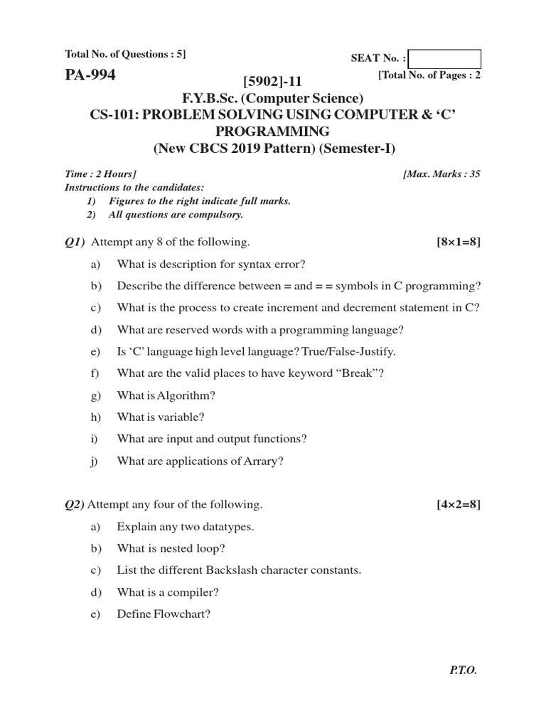 F.Y.B.Sc. CS Exam: C Programming & DBMS