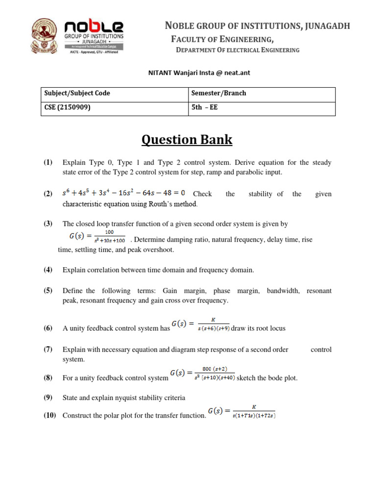 (1) Explain Type 0, Type 1 and Type 2 control system. Derive equation for the steady