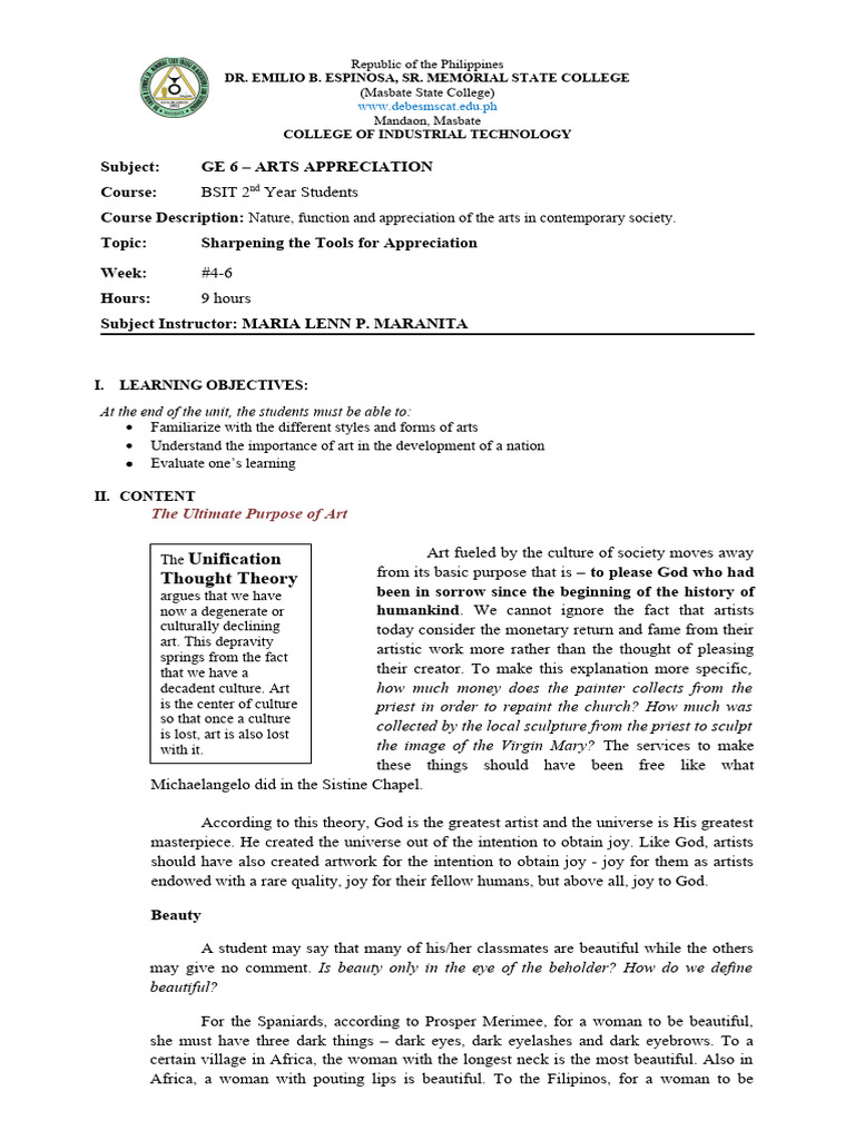 Art Appreciation: Introduction to the Humanities by Claudio V. Tabotabo et. al.,