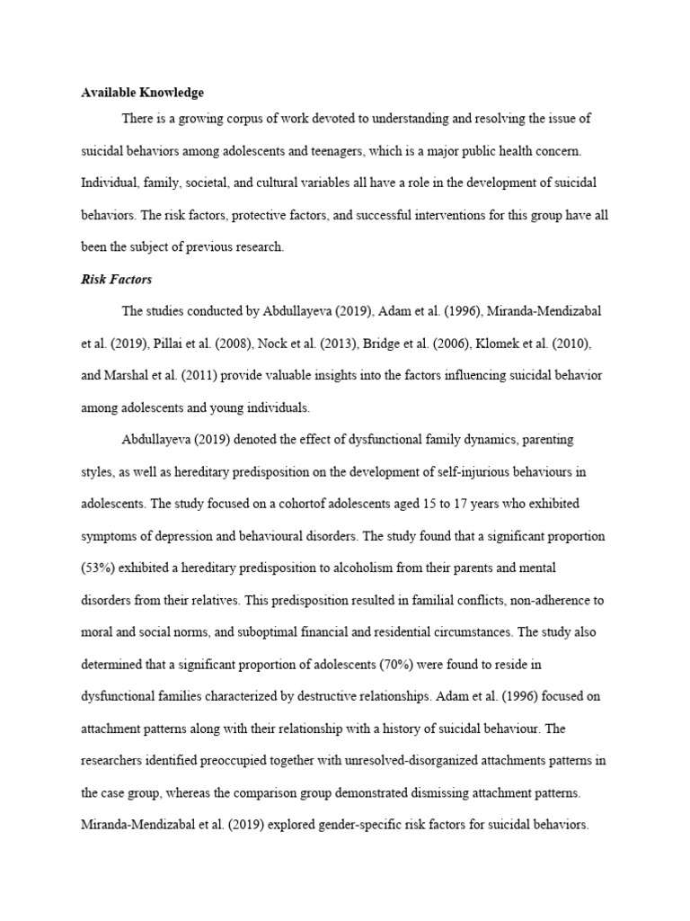 Marshal et al. (2011) highlighted additional risk factors for suicidal behavior among adolescents,