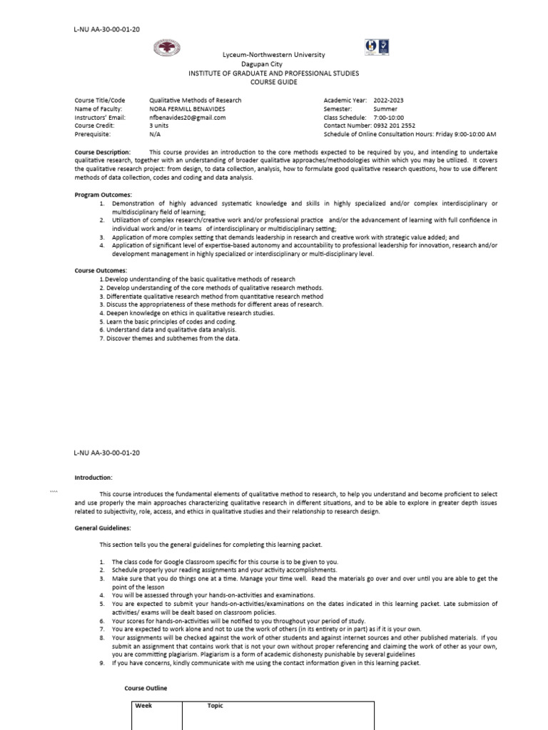Course Title/Code Qualitative Methods of Research Academic Year: 2022-2023