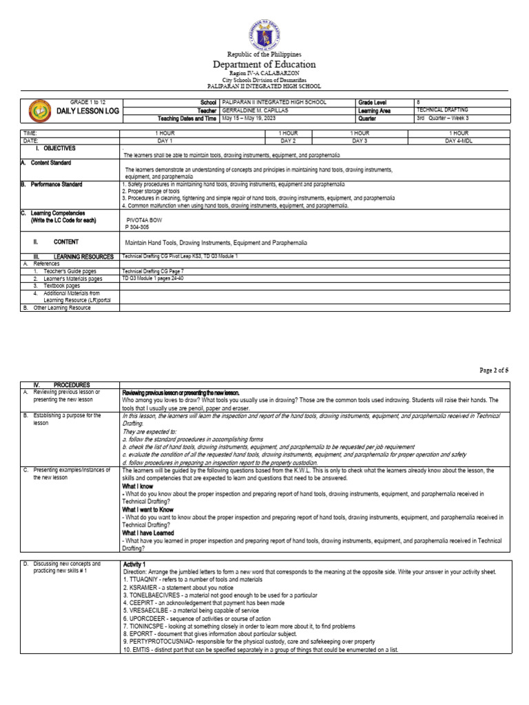 DAILY LESSON LOG Teacher GERRALDINE M. CAPILLAS Learning Area TECHNICAL DRAFTING