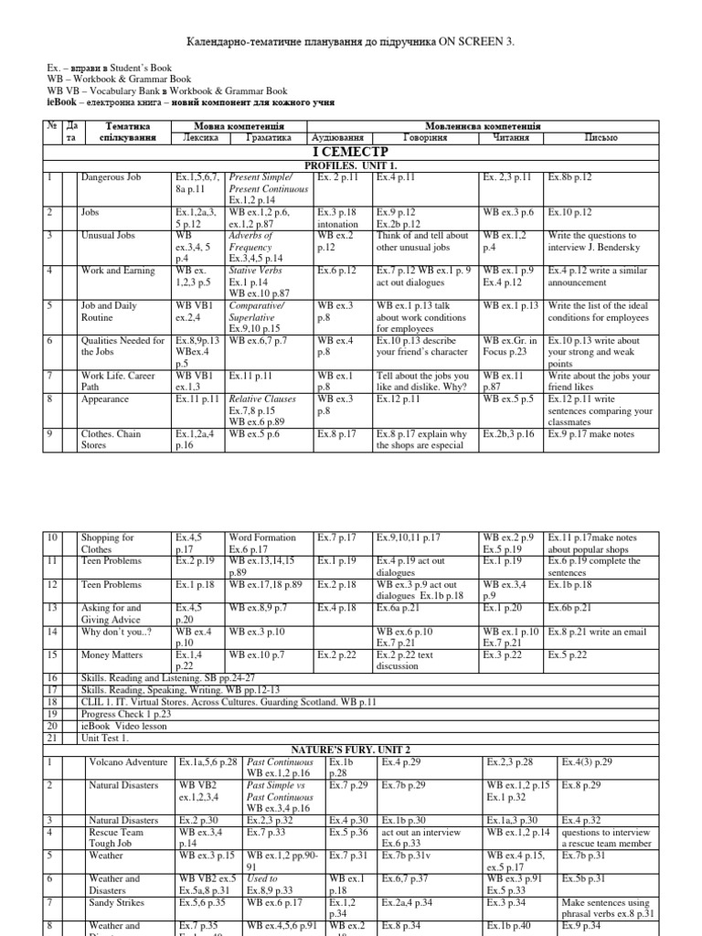 Календарно-тематичне планування до підручника ON SCREEN 3.