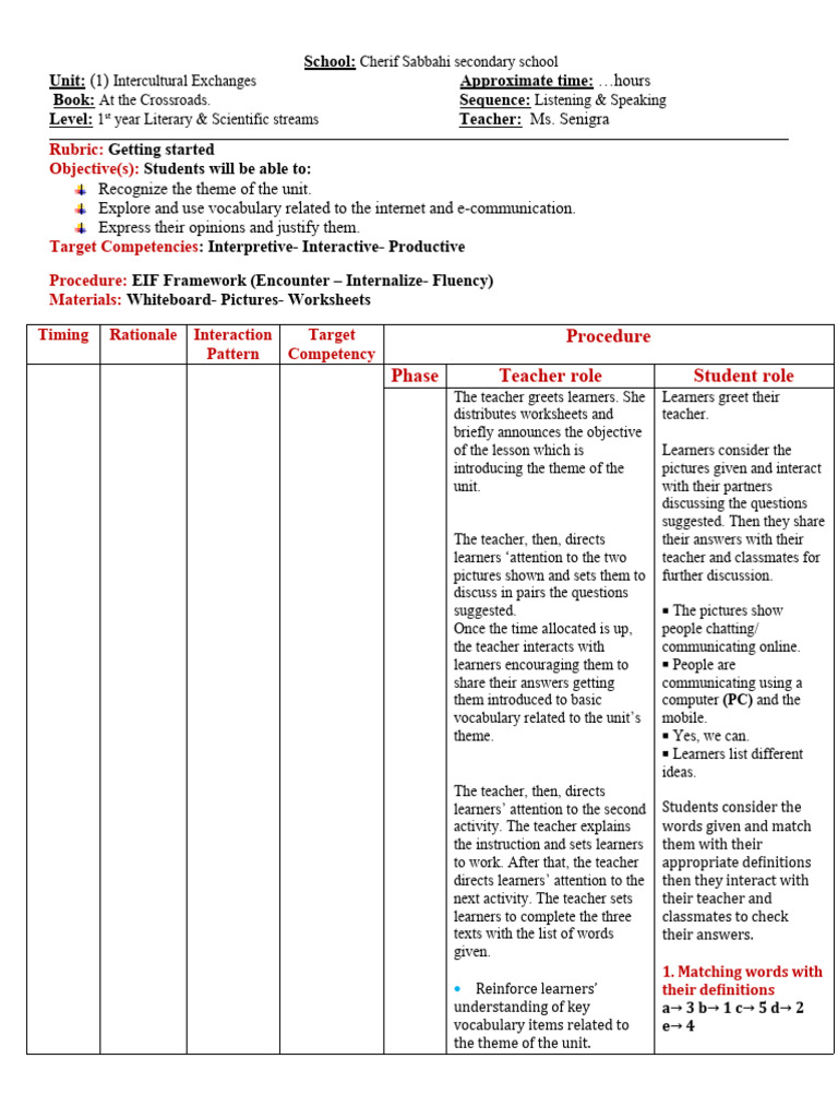 Unit: (1) Intercultural Exchanges Approximate time: …hours