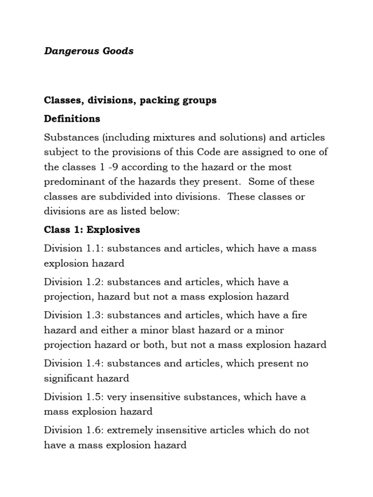 Classes, divisions, packing groups