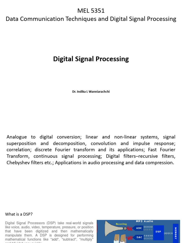 Transform, continuous signal processing; Digital filters–recursive filters,