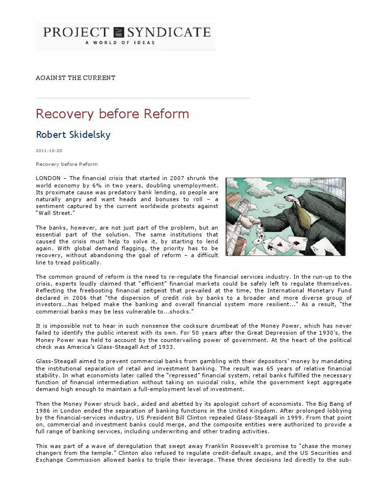 LONDON The financial crisis that started in 2007 shrunk the world economy by 6% in two years, doubling unemployment. Its proximate cause was predatory bank lending, so people are naturally angry and want heads and bonuses to roll a sentiment captured by the current worldwide protests against Wall Street. The banks, however, are not just part of the problem, but an essential part of the solution. The same institutions that caused the crisis must help to solve it, by starting to lend again. With global demand flagging, the priority has to be recovery, without abandoning the goal of reform a difficult line to tread politically. The common ground of reform is the need to re-regulate the financial services industry. In the run-up to the crisis, experts loudly claimed that efficient financial markets could be safely left to regulate themselves. Reflecting the freebooting financial zeitgeist that prevailed at the time, the International Monetary Fund declared in 2006 that the dispersion of credit risk by banks to a broader and more diverse group of investors...has helped make the banking and overall financial system more resilient... As a result, the commercial banks may be less vulnerable to...shocks. It is impossible not to hear in such nonsense the cocksure drumbeat of the Money Power, which has never failed to identify the public interest with its own. For 50 years after the Great Depression of the 1930s, the Money Power was held to account by the countervailing power of government. At the heart of the political check was Americas Glass-Steagall Act of 1933. Glass-Steagall aimed to prevent commercial banks from gambling with their depositors money by mandating the institutional separation of retail and investment banking. The result was 65 years of relative financial stability. In what economists later called the repressed financial system, retail banks fulfilled the necessary function of financial intermediation without taking on suicidal risks, while the government kept aggregate demand high enough to maintain a full-employment level of investment. Then the Money Power struck back, aided and abetted by its apologist cohort of economists. The Big Bang of 1986 in London ended the separation of banking functions in the United Kingdom. After prolonged lobbying by the financial-services industry, US President Bill Clinton repealed Glass-Steagall in 1999. From that point on, commercial and investment banks could merge, and the composite entities were authorized to provide a full range of banking services, including underwriting and other trading activities. This was part of a wave of deregulation that swept away Franklin Roosevelts promise to chase the money changers from the temple. Clinton also refused to regulate credit-default swaps, and the US Securities and Exchange Commission allowed banks to triple their leverage. These three decisions led directly to the sub-