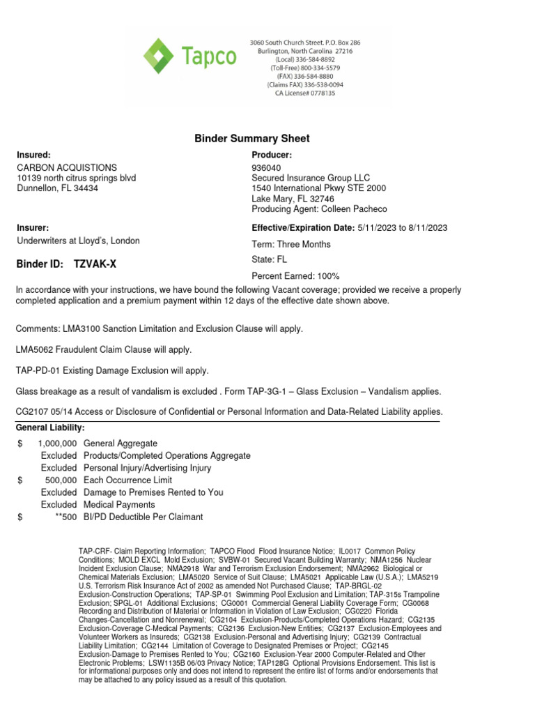 Insurer: Effective/Expiration Date: 5/11/2023 to 8/11/2023