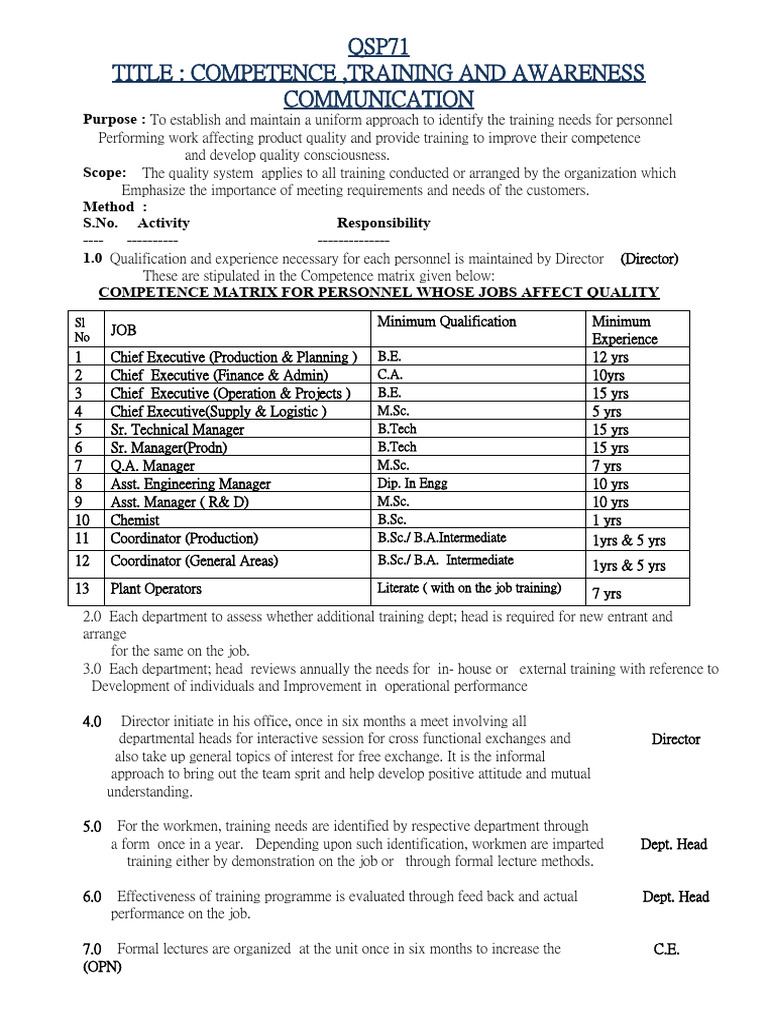 1.0 Qualification and experience necessary for each personnel is maintained by Director (Director)
