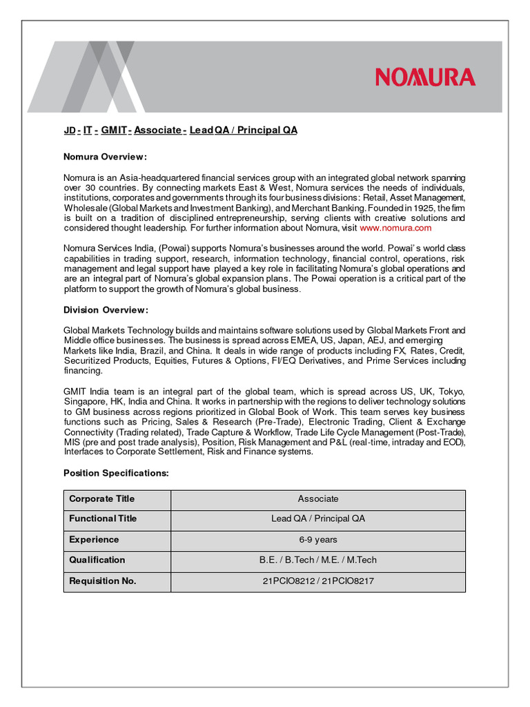 JD - IT - GMIT - Associate - Lead QA / Principal QA