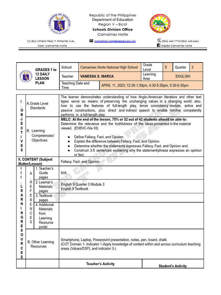 E ● Determine whether the statements expresses Fallacy, Fact, and Opinion and;