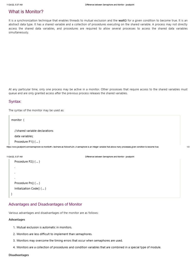 3. Semaphore is an integer variable, whereas monitor is an abstract data type.