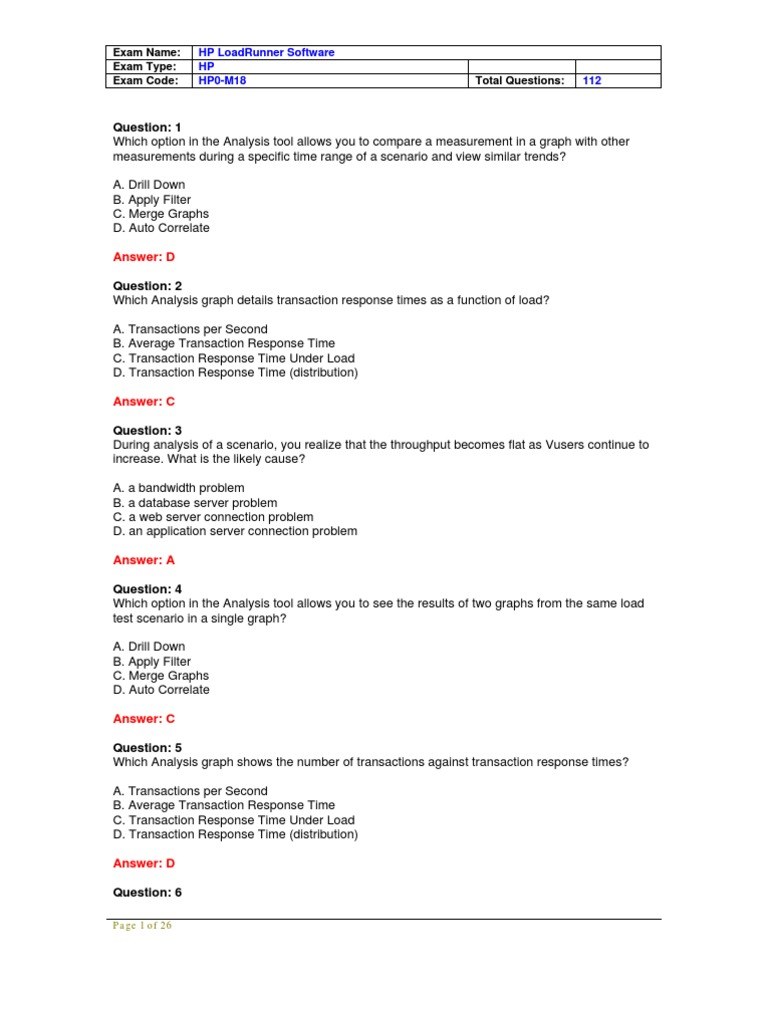 Question: 1 Which option in the Analysis tool allows you to compare a measurement in a graph with other measurements during a specific time range of a scenario and view similar trends? A. Drill Down B. Apply Filter C. Merge Graphs D. Auto Correlate Answer: D Question: 2 Which Analysis graph details transaction response times as a function of load? A. Transactions per Second B. Average Transaction Response Time C. Transaction Response Time Under Load D. Transaction Response Time (distribution) Answer: C Question: 3 During analysis of a scenario, you realize that the throughput becomes flat as Vusers continue to increase. What is the likely cause? A. a bandwidth problem B. a database server problem C. a web server connection problem D. an application server connection problem Answer: A Question: 4 Which option in the Analysis tool allows you to see the results of two graphs from the same load test scenario in a single graph? A. Drill Down B. Apply Filter C. Merge Graphs D. Auto Correlate Answer: C Question: 5 Which Analysis graph shows the number of transactions against transaction response times? A. Transactions per Second B. Average Transaction Response Time C. Transaction Response Time Under Load D. Transaction Response Time (distribution) Answer: D Question: 6