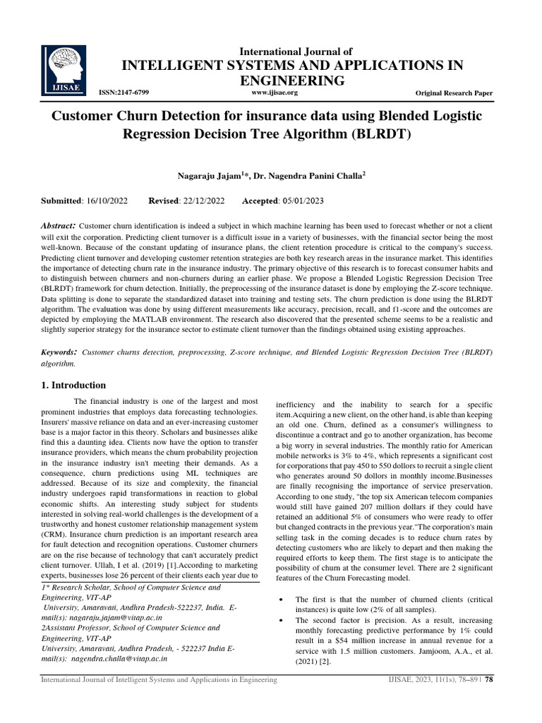 Keywords: Customer churns detection, preprocessing, Z-score technique, and Blended Logistic Regression Decision Tree (BLRDT)