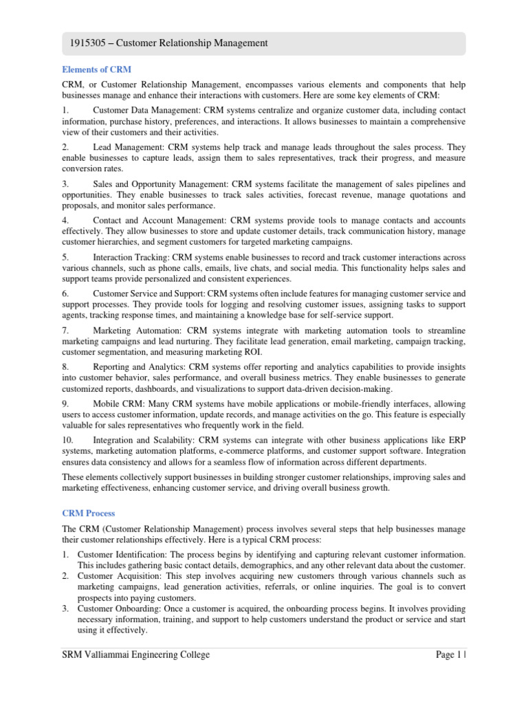 CRM, or Customer Relationship Management, encompasses various elements and components that help