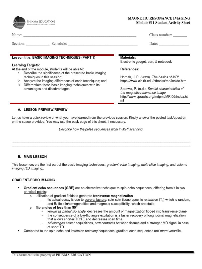 This lesson covers the first part of the basic imaging techniques: gradient-echo imaging, multi-slice imaging, and volume