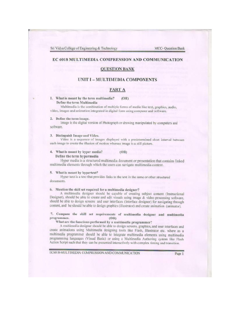 [EGHOIS-MULTIMEDIA COMPRESSION AND CONMUNICATION PagetseiVidya College ofFginering Technology ‘MCC- Question Bank