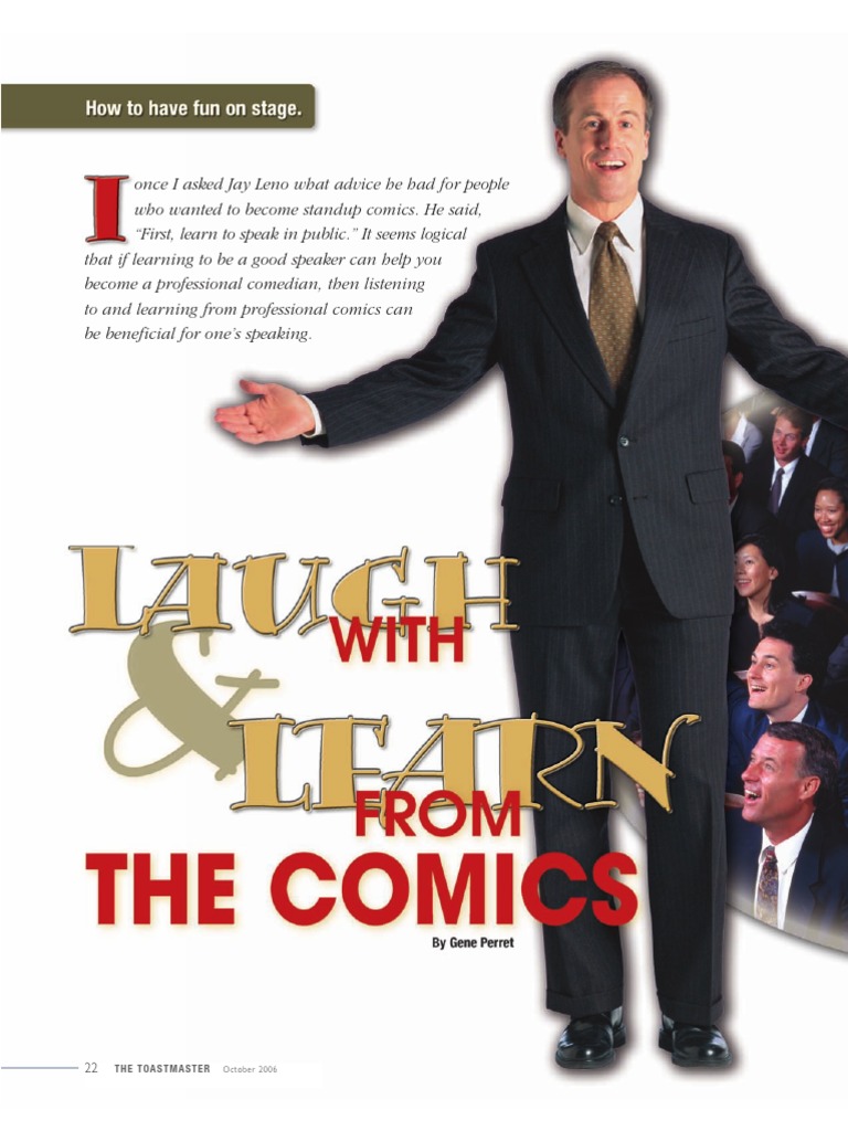He said, First, learn to speak in public. It seems logical that if learning to be a good speaker can help you become a professional comedian, then listening to and learning from professional comics can be beneficial for ones speaking.