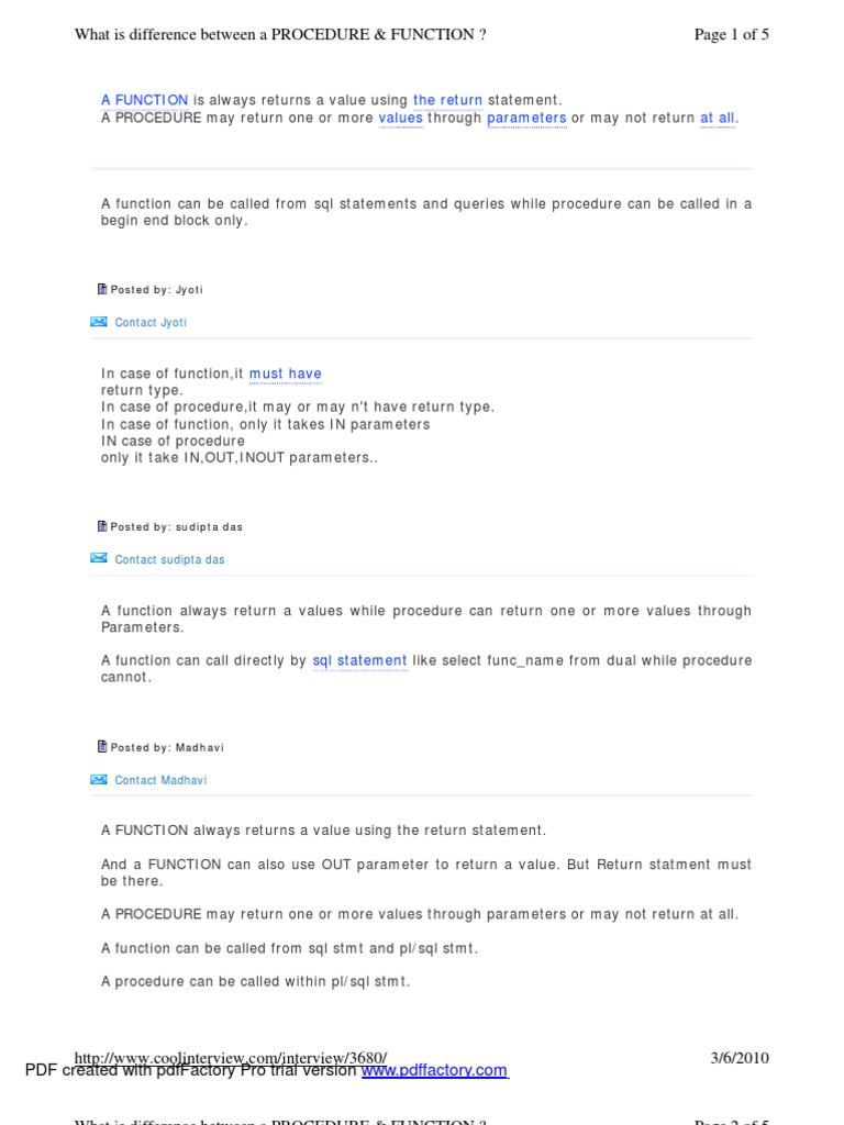 Difference between Stored Procedure and Application Procedure: Stored Procedure is a named PLSQL block that will be compiled and used for further use. If maintained across Servers, they can be used for different applications and Users. Application Procedures are the one which will be used for local apps, this can be called local block of code. Apart from technical characteristics, same will apply to the differences between Stored Functions and Application Functions. Difference between Procedures and Functions: a. Functions can be used in a select statement where as procedures cannot b. Procedure takes both input and output parameters but Functions takes only input parameters c. Functions cannot return values of type text, ntext, image & timestamps where as procedures can d. Functions can be used as user defined datatypes in create table but procedures cannot ***Eg:-create table <tablename>(name varchar(10),salary getsal(name)) Here getsal is a user defined function which returns a salary type, when table is created no storage is allotted for salary type, and getsal function is also not executed, But when we are fetching some values from this table, getsal function get?s executed and the return Type is returned as the result set.