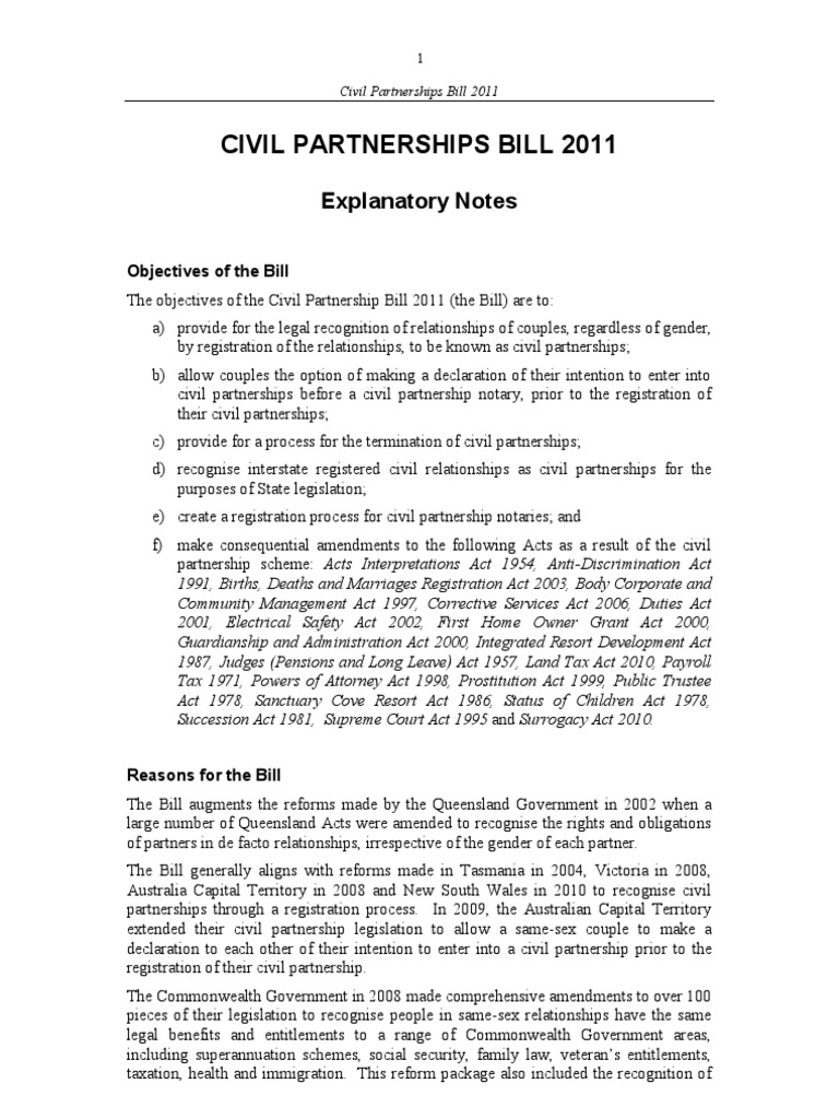 Objectives of the Bill The objectives of the Civil Partnership Bill 2011 (the Bill) are to: a) provide for the legal recognition of relationships of couples, regardless of gender, by registration of the relationships, to be known as civil partnerships; b) allow couples the option of making a declaration of their intention to enter into civil partnerships before a civil partnership notary, prior to the registration of their civil partnerships; c) provide for a process for the termination of civil partnerships; d) recognise interstate registered civil relationships as civil partnerships for the purposes of State legislation; e) create a registration process for civil partnership notaries; and f) make consequential amendments to the following Acts as a result of the civil partnership scheme: Acts Interpretations Act 1954, Anti-Discrimination Act 1991, Births, Deaths and Marriages Registration Act 2003, Body Corporate and Community Management Act 1997, Corrective Services Act 2006, Duties Act 2001, Electrical Safety Act 2002, First Home Owner Grant Act 2000, Guardianship and Administration Act 2000, Integrated Resort Development Act 1987, Judges (Pensions and Long Leave) Act 1957, Land Tax Act 2010, Payroll Tax 1971, Powers of Attorney Act 1998, Prostitution Act 1999, Public Trustee Act 1978, Sanctuary Cove Resort Act 1986, Status of Children Act 1978, Succession Act 1981, Supreme Court Act 1995 and Surrogacy Act 2010. Reasons for the Bill The Bill augments the reforms made by the Queensland Government in 2002 when a large number of Queensland Acts were amended to recognise the rights and obligations of partners in de facto relationships, irrespective of the gender of each partner. The Bill generally aligns with reforms made in Tasmania in 2004, Victoria in 2008, Australia Capital Territory in 2008 and New South Wales in 2010 to recognise civil partnerships through a registration process. In 2009, the Australian Capital Territory extended their civil partnership legislation to allow a same-sex couple to make a declaration to each other of their intention to enter into a civil partnership prior to the registration of their civil partnership. The Commonwealth Government in 2008 made comprehensive amendments to over 100 pieces of their legislation to recognise people in same-sex relationships have the same legal benefits and entitlements to a range of Commonwealth Government areas, including superannuation schemes, social security, family law, veterans entitlements, taxation, health and immigration. This reform package also included the recognition of