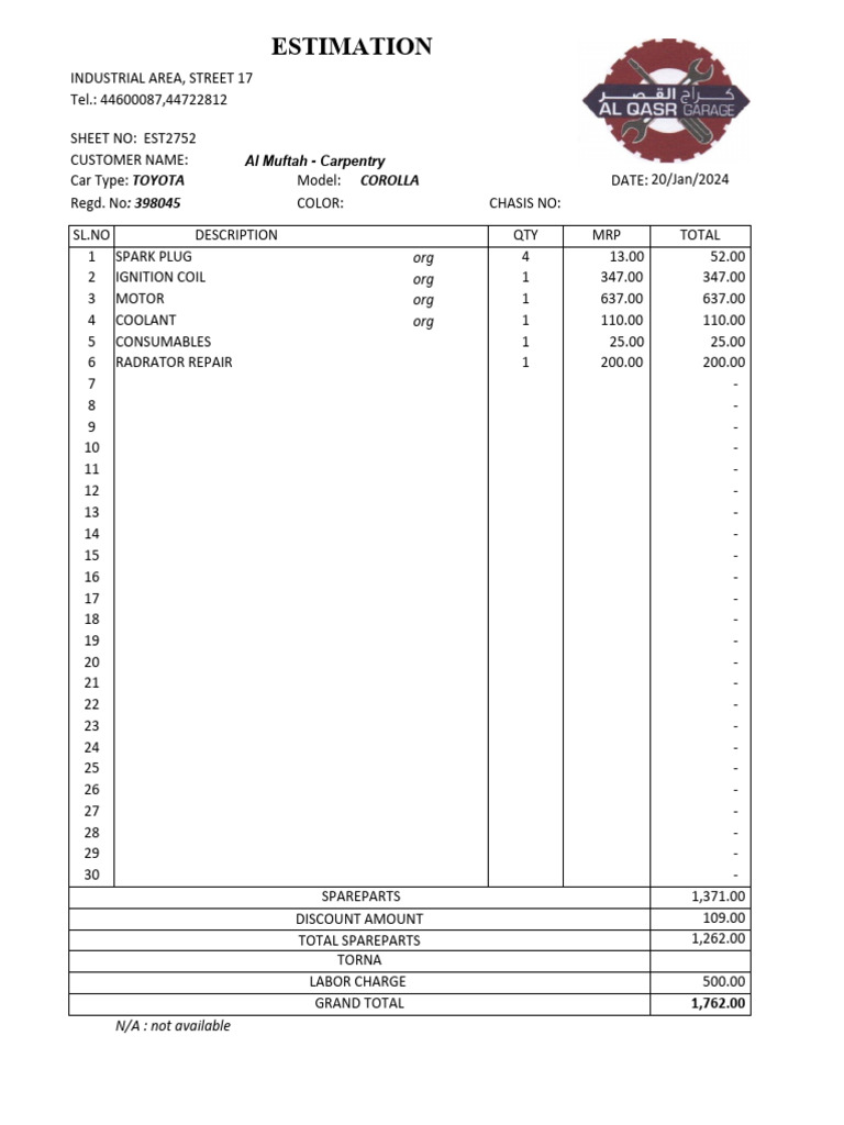 NB: GRAND TOTAL MAYBE CHANGED DEPENDING ON THE SPARE PARTS AND THE ACTUAL WORK DONE