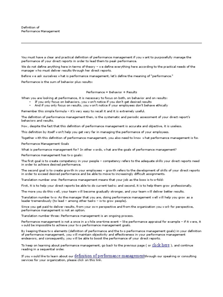 You must have a clear and practical definition of performance management if you want to purposefully manage the performance of your direct reports in order to lead them to peak performance. We do not define anything here in terms of theory we define everything here according to the practical needs of the manager who must deliver results through her direct reports. Before we ask ourselves what is performance management, lets define the meaning of performance. Performance is the sum of behavior plus results: Performance = Behavior + Results When you are looking at performance, it is necessary to focus on both, on behavior and on results: If you only focus on behaviors, you wont notice if you dont get desired results And if you only focus on results, you wont notice if your employees dont behave ethically Remember this simple formula its very easy to recall it and it is extremely useful. The definition of performance management then, is the systematic and periodic assessment of your direct reports behaviors and results. Now, despite the fact that this definition of performance management is accurate and objective, it is useless. This definition by itself wont help you get very far in managing the performance of your employees. Together with this definition of performance management, you also need to know what performance management is for. Performance Management Goals What is performance management for? In other words, what are the goals of performance management? Performance management has two goals: The first goal is to create competency in your people competency refers to the adequate skills your direct reports need in order to achieve desired performance. The second goal is to create growth in your employees growth refers to the development of skills of your direct reports in order to exceed desired performance and be able to move to increasingly difficult assignments. Translation number one: Performance management means that your job as the boss is two-fold: First, it is to help your direct reports be able to do current tasks; and second, it is to help them grow professionally. The more you do this well, your team will become gradually stronger, and your team will deliver better results. Translation number two: As the manager that you are, doing performance management well will help you grow as a leader tremendously (to lead among other tasks is to grow people). Since you get paid to deliver results, from your own perspective and from the organization you work for perspective, performance management is not an option. Translation number three: Performance management is an ongoing process. Performance management is not a once in a while one-time event like performance appraisal for example if it were, it would be impossible to achieve your two performance management goals. By keeping these two elements (definition of performance and the two performance management goals) in your definition of performance management, you will maintain objectivity and effectiveness in your performance management endeavors, and consequently, you will be able to boost the performance of your direct reports. To keep on learning about performance management, go back to the previous page ( or reading in a sequential order. If you would like to learn about our definition of performance services for your organization, please click on this link.