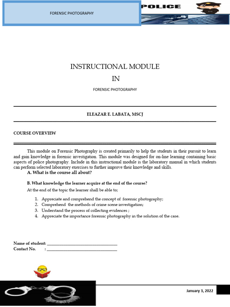 This module on Forensic Photography is created primarily to help the students in their pursuit to learn