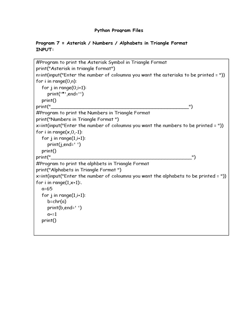 Program 7 = Asterisk / Numbers / Alphabets in Triangle Format