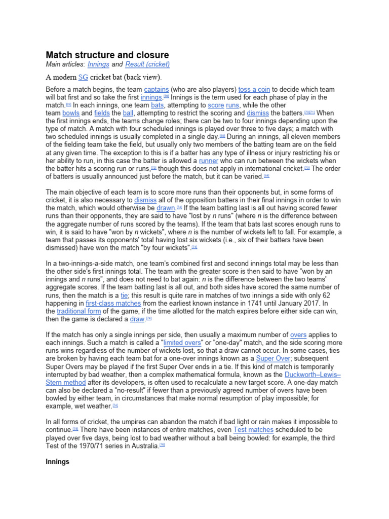 match.[69] In each innings, one team bats, attempting to score runs, while the other